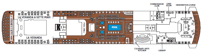 服務內容:La Veranda 的早、午兩餐供應自助式餐點。 可以在別緻的室內用餐室或陰涼的露天甲板上享受優雅的早餐和自助午餐,同時欣賞壯麗的海景。早餐包括傳統美食、定制煎蛋捲、各種新鮮水果和糕點,以及每日特色菜,如蓬鬆的比利時華夫餅和新鮮藍莓蜜餞。午餐時,可以盡情享受豐富的沙拉吧、美味三明治和美味甜點等選擇。晚餐時間 La Veranda 則會化身為義式餐廳,提供道地的義大利料理。