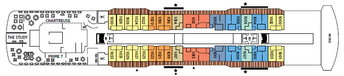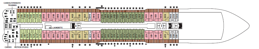 Seven Seas Explorer 上有 375 間艙房,每間艙房均附有陽台(套房 65 間、陽台客房 215 間),船上最小的艙房 9 坪,數量最多的Concierge Suite則是12~13坪。