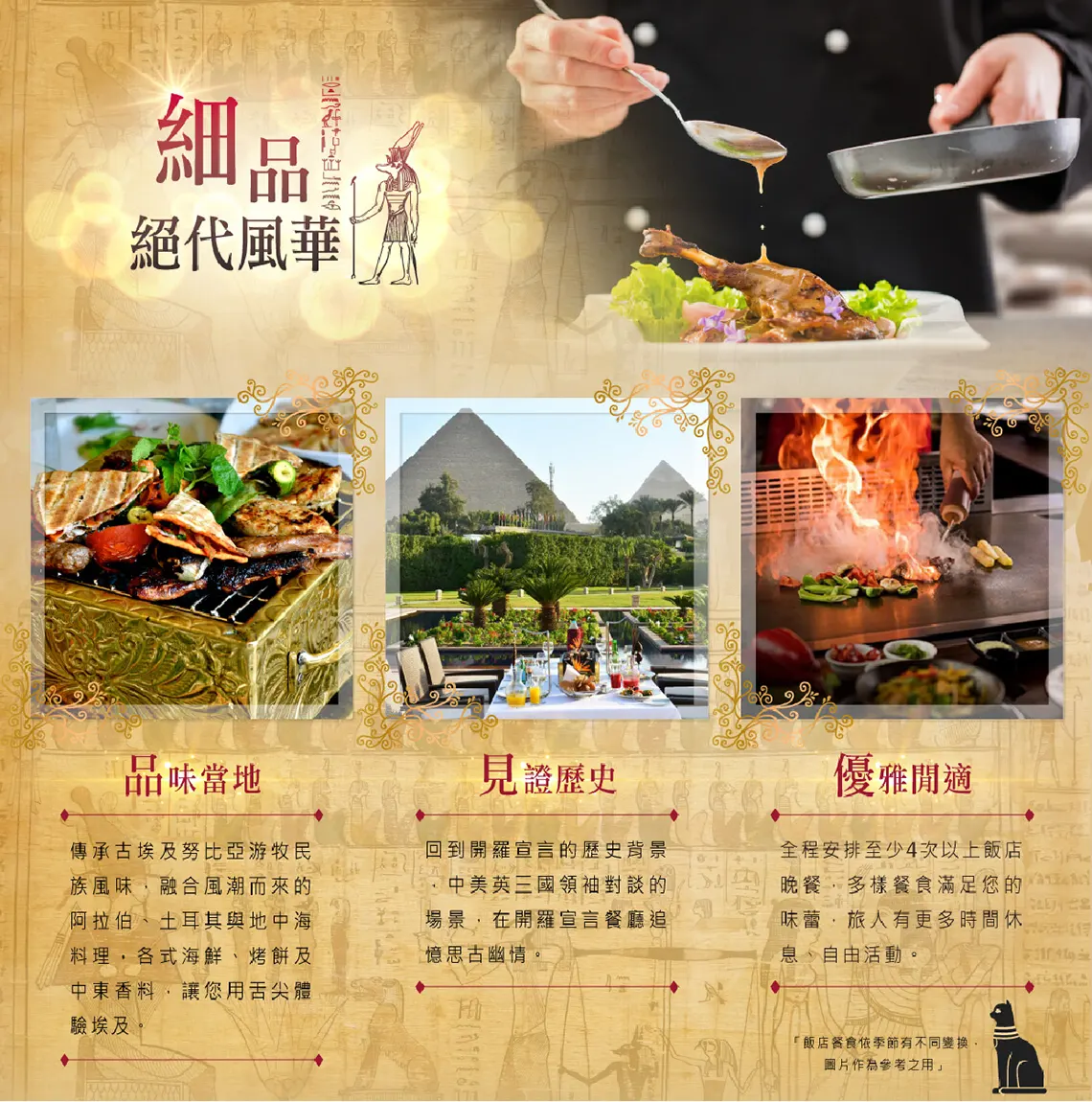埃及文化的全盛富饒反應在古埃及遊牧民族的生活及平民的餐食,讓我們從舌尖味蕾了解埃及!