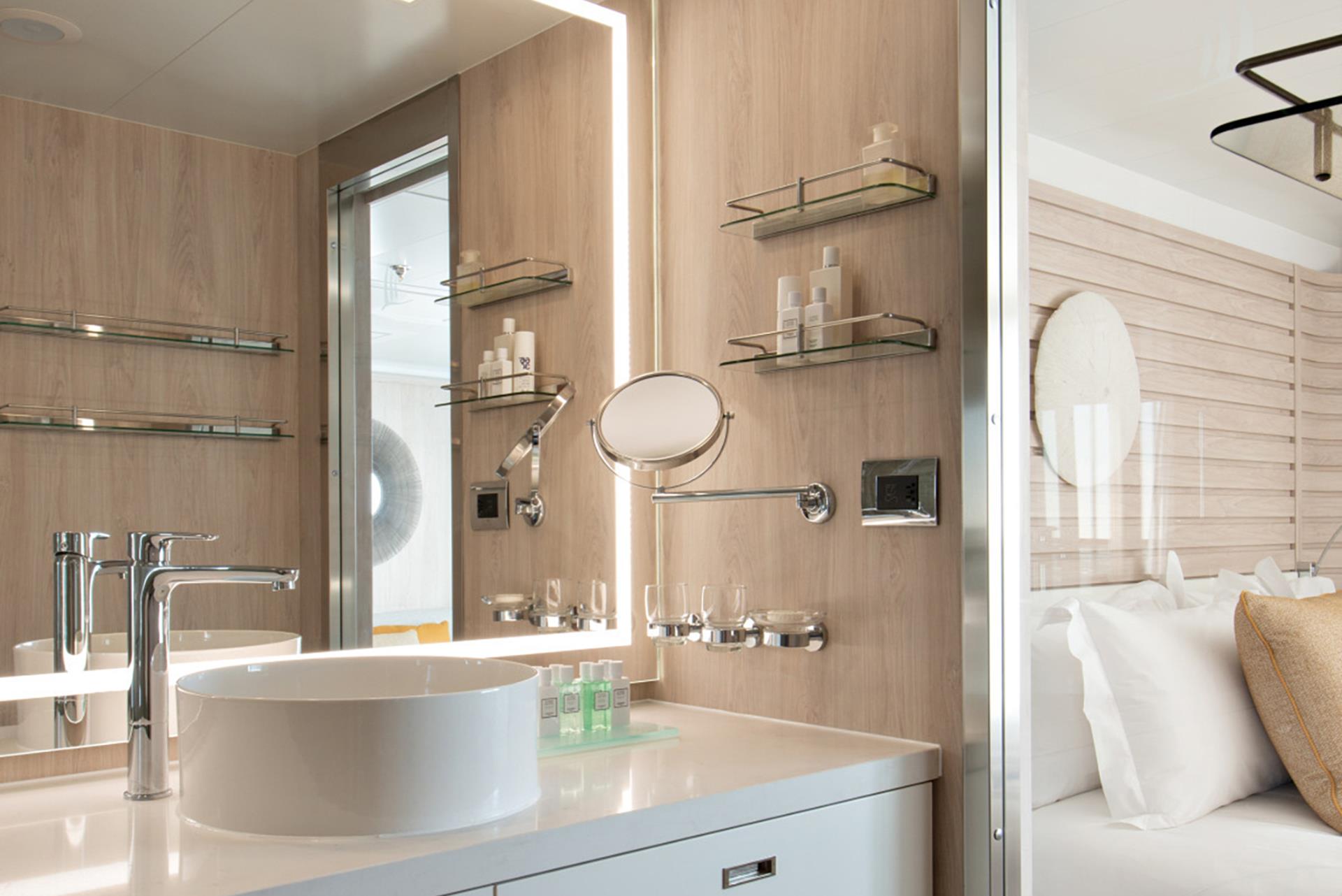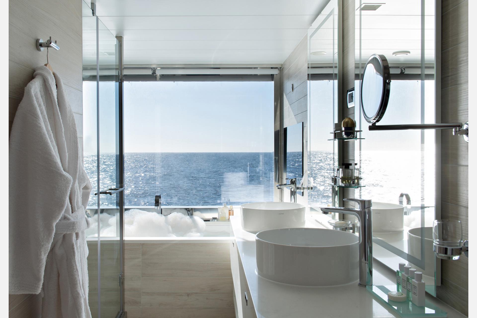● 二台電視、扶手椅、浴室配有淋浴、Balneo 浴缸和智能鏡子、一小時SPA護理:每人(2 人)在健康空間享受一小時的水療護理,從提供的臉部和身體護理中可選擇酒吧的高級飲品、40m²私人陽台(2張躺椅、按摩浴缸、沙發、扶手椅) 兩扇全景落地窗。