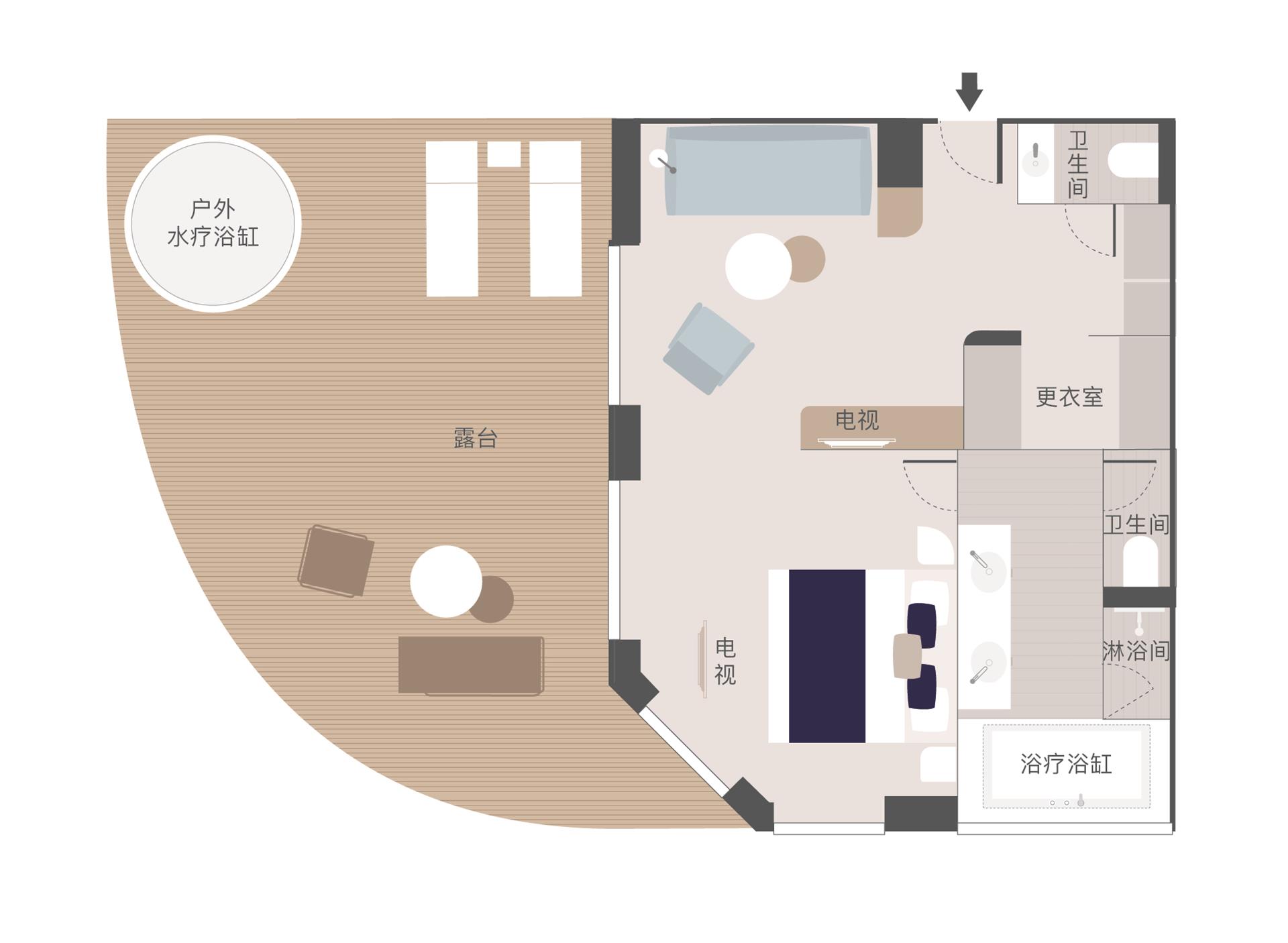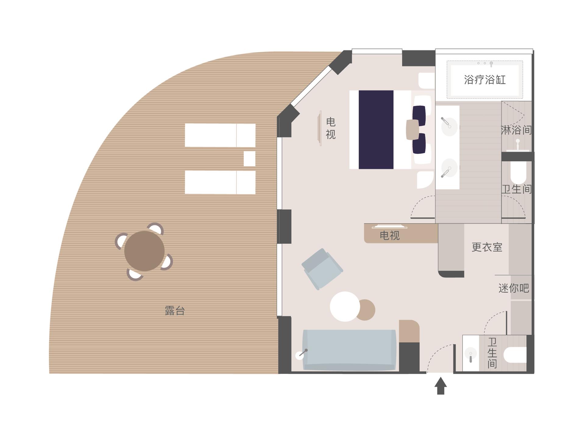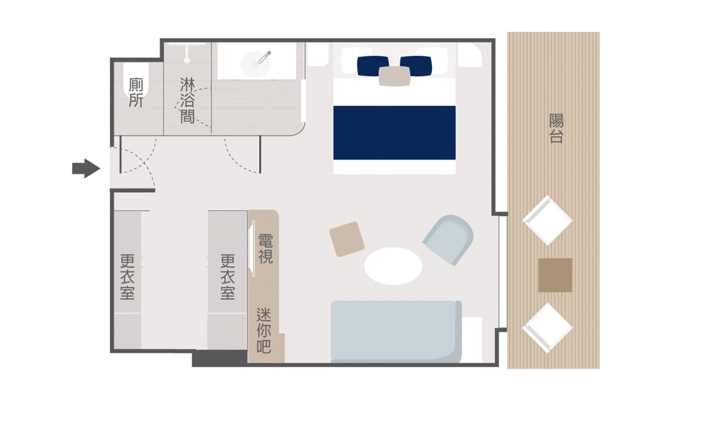 ● 梳妝台、頂級沐浴備品、迷你酒吧、膠囊咖啡機、藍牙音箱、衛星電視頻道和可選式影音系統