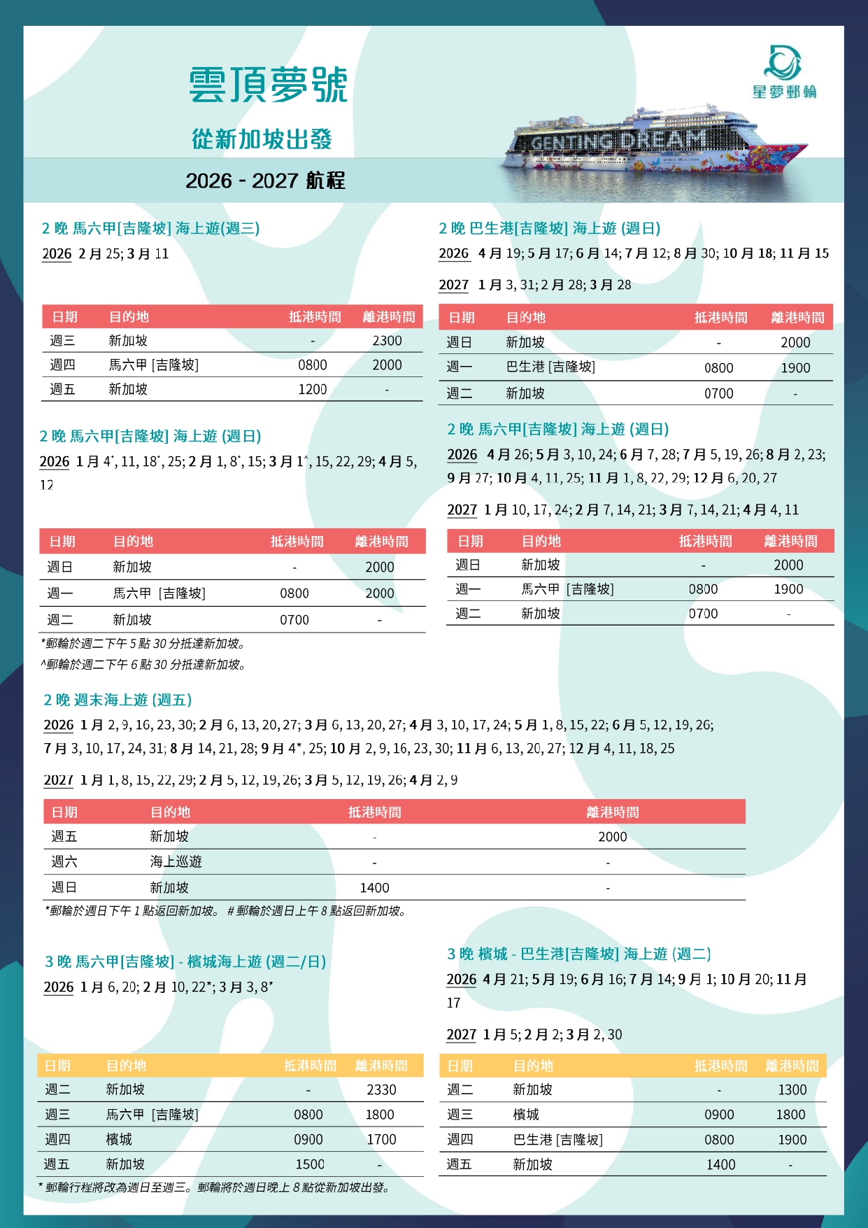 ※雲頂夢號,郵輪2晚艙房+1晚新加坡住宿+新加坡來回機票+三趟接送+稅金+港務費: